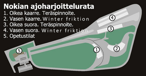 Liikenneturvallisuuskeskuksessa ajetaan ympäri vuoden neljällä erilaisella harjoittelualueella, joista kaksi on päällystetty teräslevyllä ja kaksi Winter friktion-päällysteellä. Harjoittelualueiden olosuhteiden liukkaus on kevyestä liukkaudesta lumiseen tienpintaan, aivan kuin oikeissa olosuhteissa. Talvisin harjoitellaan jäädytetyillä ajoradoilla. Kesällä liukkaus saadaan aikaan levittämällä pinnoille vettä.